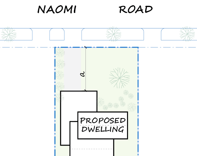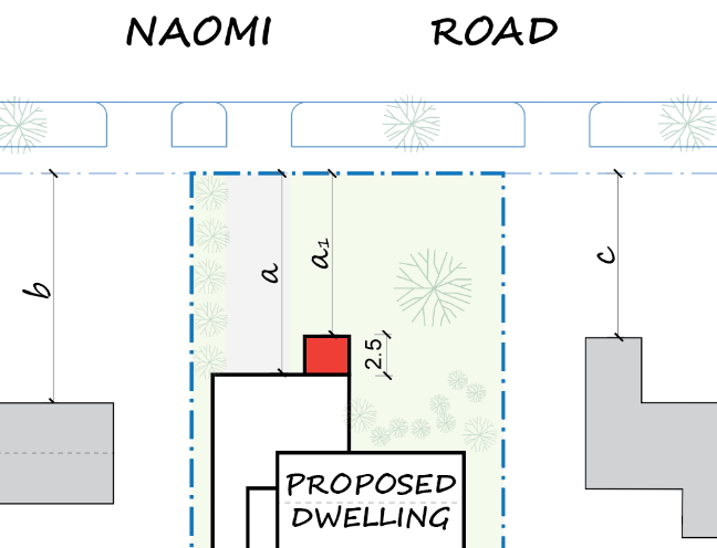 The minimum front setback along Naomi Road can be the same distance as the adjoining site or 9m, whichever is lesser: a = c