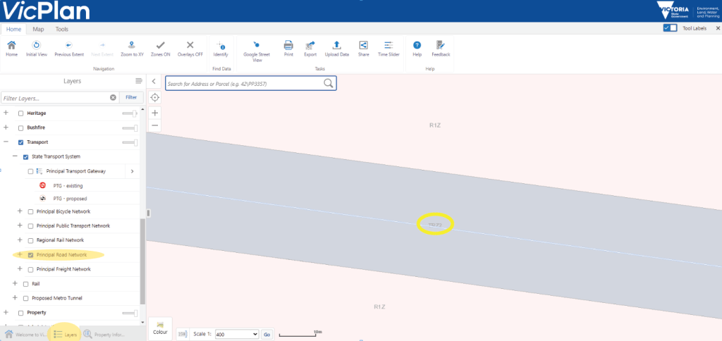 Enter address, click ‘layers’ and tick ‘Principal Road Network’ under Transport. Transport zone will appear in the centre of the road