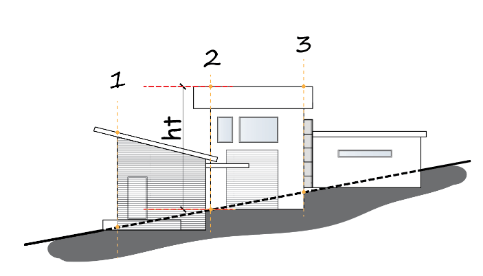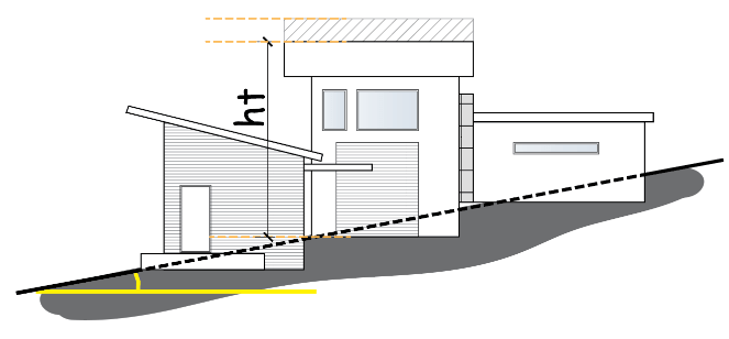 An additional 1m of height is allowed if the slope of the natural ground exceeds 2.5° over a cross section of at least 8m. This example is clearly in excess of 2.5° over any 8m section of land where the building will be sited. In reference to this diagram, excludes green shaded area Diagram 3
