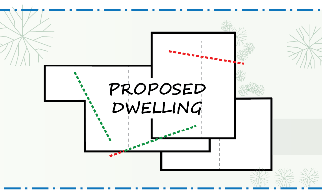 The green dashed line applies because it’s within the building area; the red does not apply because it extends beyond the building outline. The red/green line applies if the green portion is at least 8m long within the building outline.